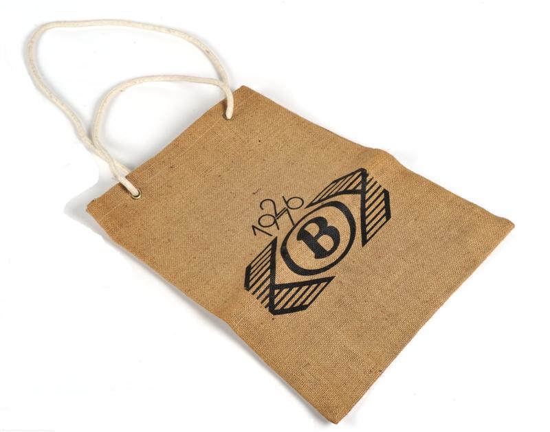 BeschrijvingBruine zak van gonje met twee witte koorden als handvaten. Op de zak staat het NMBS-logo met het opschrift '1926 1976'.