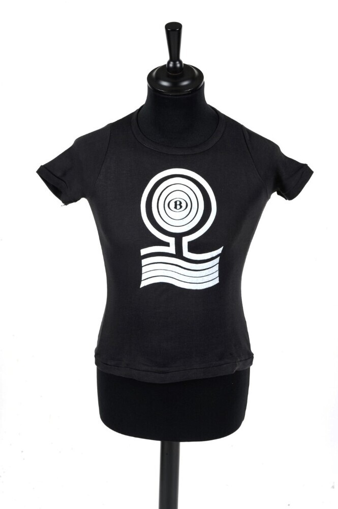 BeschrijvingZwart T-shirt met witte print van het NMBS-logo in een abstracte afbeelding van een boom. Dit T-Shirt werd gedragen door deelnemers aan de vakanties voor kinderen van spoorwegpersoneel, georganiseerd door de NMBS.