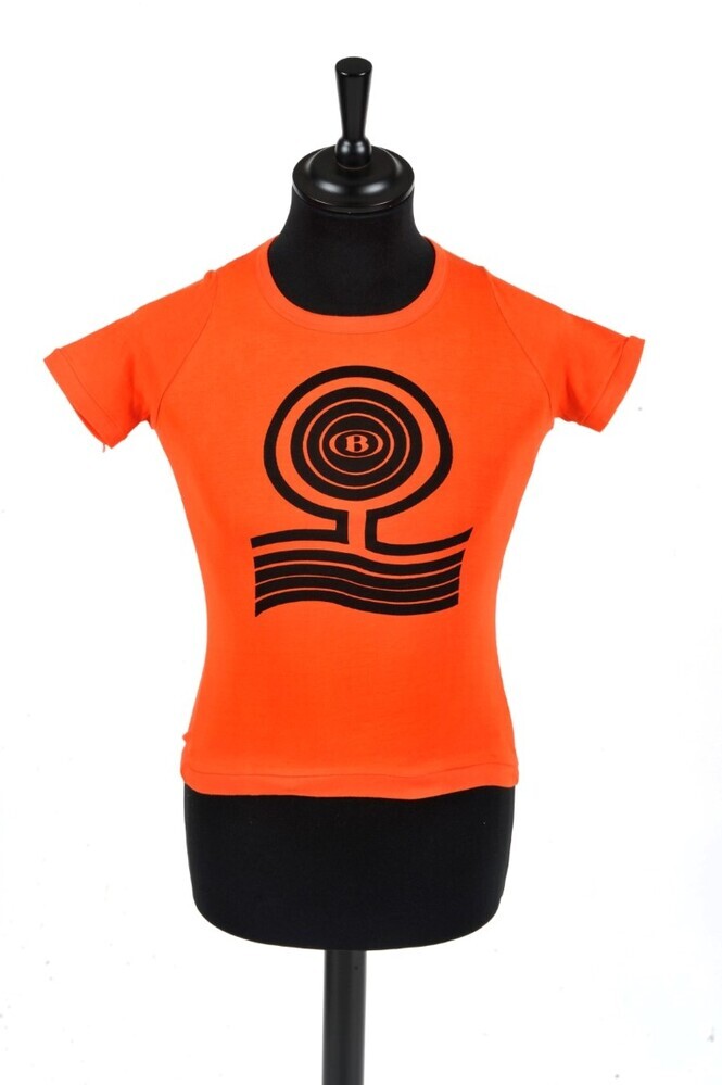 BeschrijvingOranje T-shirt met zwarte print van het NMBS-logo in een abstracte afbeelding van een boom. Dit T-Shirt werd gedragen door deelnemers aan de vakanties voor kinderen van spoorwegpersoneel, georganiseerd door de NMBS.
