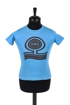 BeschrijvingBlauw T-shirt met zwarte print van het NMBS-logo in een abstracte afbeelding van een boom. Dit T-Shirt werd gedragen door deelnemers aan de vakanties voor kinderen van spoorwegpersoneel, georganiseerd door de NMBS.