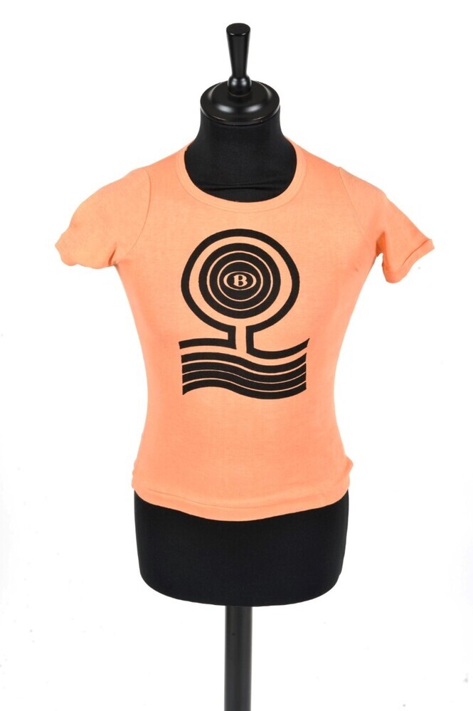 BeschrijvingZalmroze T-shirt met zwarte print van het NMBS-logo in een abstracte afbeelding van een boom. Dit T-Shirt werd gedragen door deelnemers aan de vakanties voor kinderen van spoorwegpersoneel, georganiseerd door de NMBS.