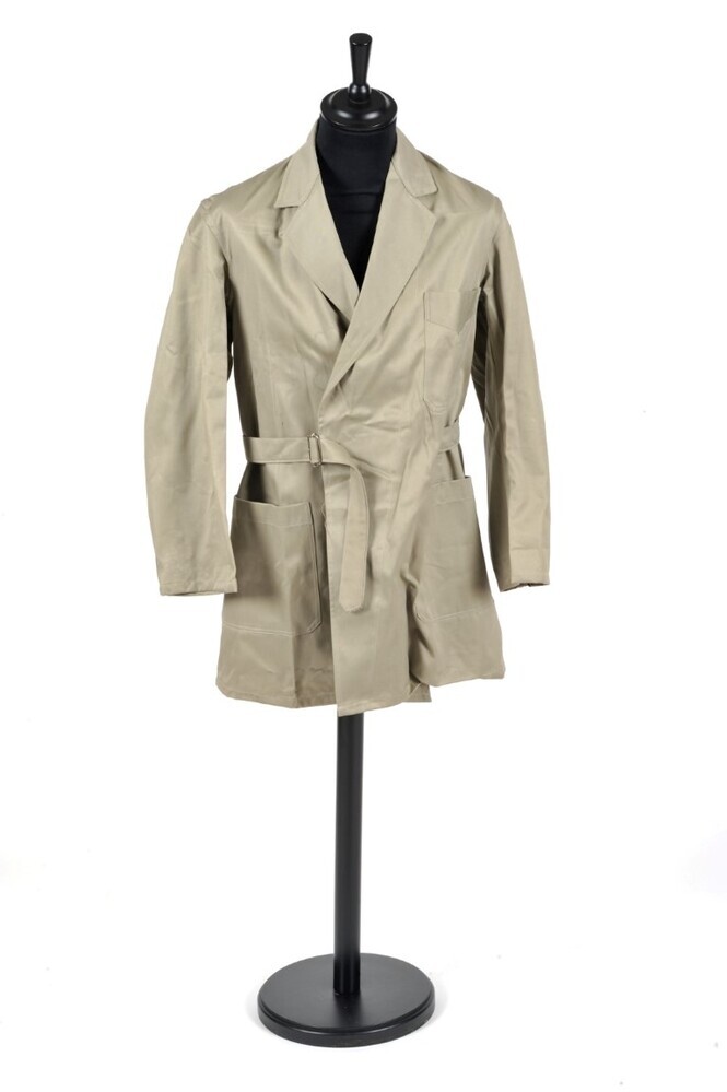 BeschrijvingDeze grijze stofjas heeft twee diepe zakken en een borstzakje. De jas kan door een stoffen riem in dezelfde kleur gesloten worden.