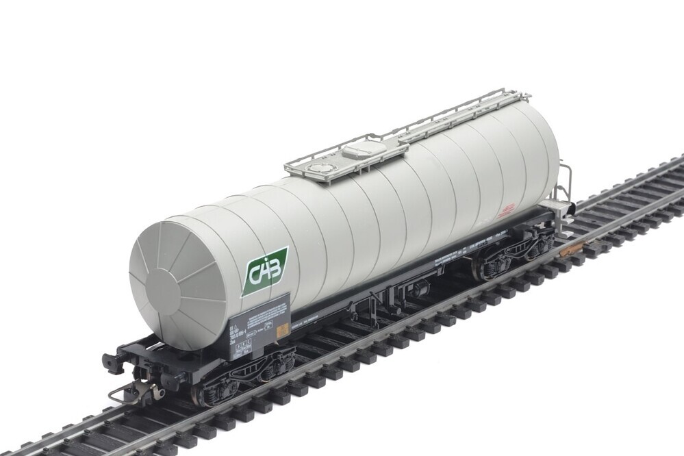 Grijze ketelwagen voor het vervoer van witte petroleumproducten waarvan de dampdruk bij 50°C niet groter is dan 1,75 bar. Op de wagen staan verschillende opschriften, waaronder het wagennummer, een fabriekslogo (CAIB), het typenummer 2000H2, de lettercode Zas en het logo van de NMBS. De maquette is op schaal H0 1/87 vervaardigd.