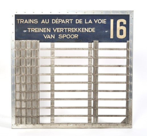 TitelMetalen treinaankondiger 'Trains au départ de la voie Treinen vertrekkende van het spoor 16'