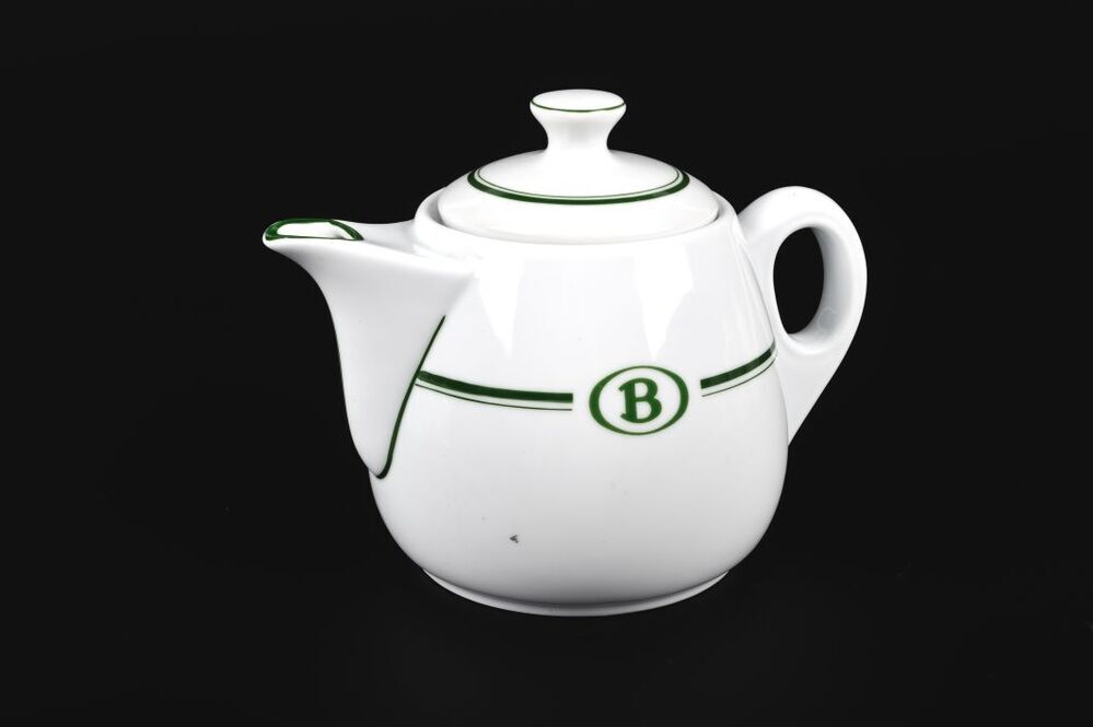 BeschrijvingWitte kan met een dubbele groene bies en het NMBS-logo. De kan heeft een dekseltje met groene biezen en ook de platte tuit en het oor zijn afgewerkt met een groen biesje.