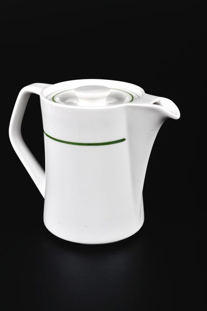 BeschrijvingWitte kan met een enkele groene bies en een schuine tuit. Ook het deksel heeft een groene bies.