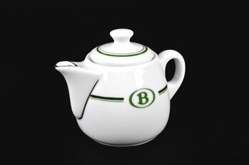 BeschrijvingWitte kan met twee groene biezen en het NMBS-logo. De kan heeft een dekseltje met groene biezen en ook de platte tuit en het oor zijn afgewerkt met een groen biesje.
