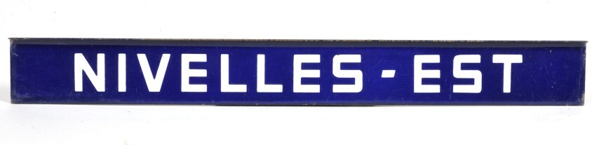 BeschrijvingBlauw bordje met witte letters. Werd aan een treinaankondiger gehangen om treinen richting Nijvel aan te kondigen.