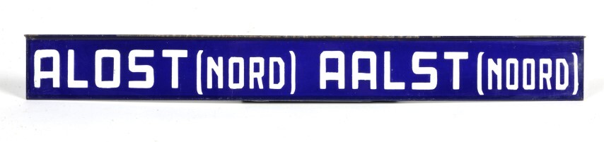 BeschrijvingBlauw bordje met witte letters. Werd aan een treinaankondiger gehangen om treinen richting Aalst aan te kondigen.