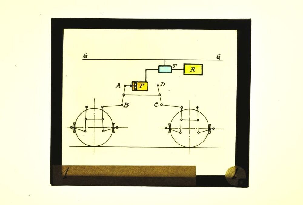 Dit glasplaatje werd als didactisch materiaal gebruikt bij de opleiding van spoorwegpersoneel. Er staat een diagram op dat de werking illustreert van een pneumatische rem van rollend materieel. De tekening is in de kleuren blauw, groen, geel en zwart uitgevoerd.