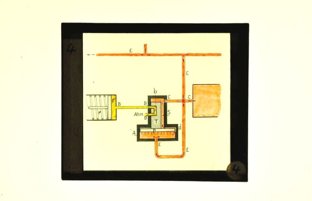 BeschrijvingDit glasplaatje werd als didactisch materiaal gebruikt bij de opleiding van spoorwegpersoneel. Er staat een diagram op dat de werking van een remmingssysteem illustreert. De tekening is in de kleuren rood, geel en zwart uitgevoerd.