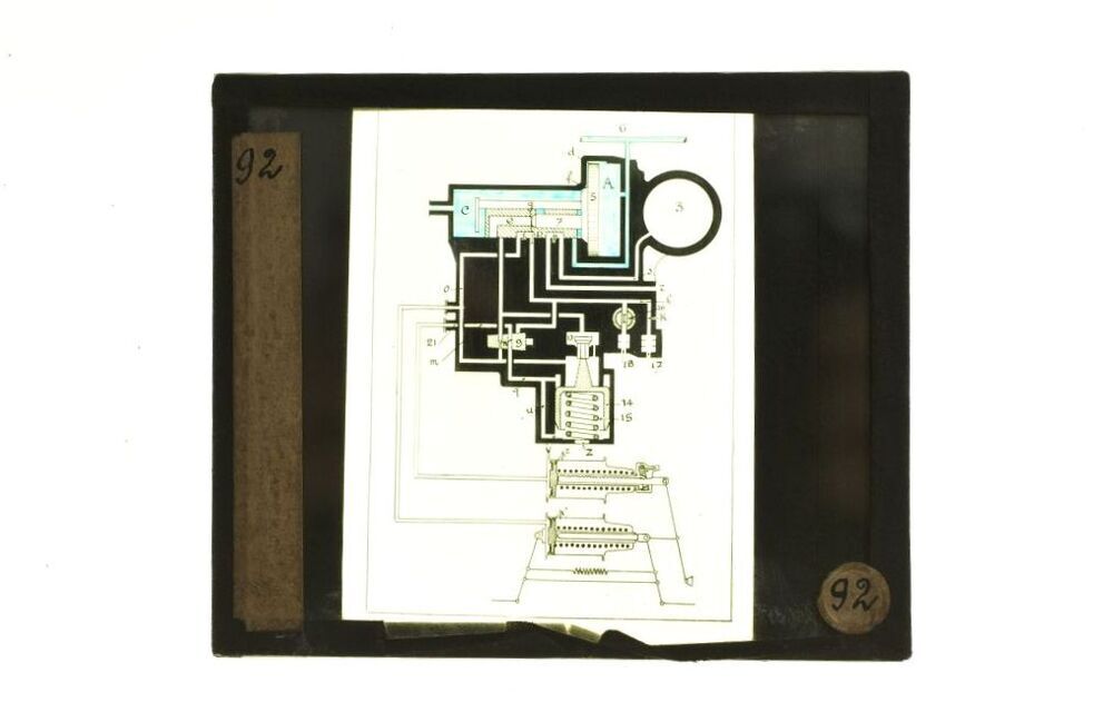 BeschrijvingDit glasplaatje werd als didactisch materiaal gebruikt bij de opleiding van spoorwegpersoneel. Er staat een diagram op dat de werking van een bepaald toestel of onderdeel illustreert. De tekening is in de kleuren blauw en zwart uitgevoerd.