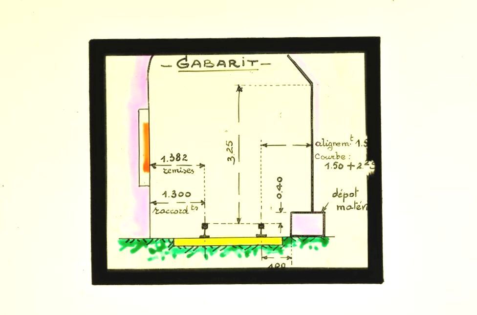Dit glasplaatje werd als didactisch materiaal gebruikt bij de opleiding van spoorwegpersoneel. Op het plaatje staat een laadprofiel of omgrenzingsprofiel. Dit was een metalen boog waar de wagens onder moesten rijden om na te kijken of hun lading niet te breed of te hoog was voor tunnels, bruggen en tegenliggende sporen. De wagens waren verplicht om in het goederenstation het laadprofiel te passeren voor ze de sporen op mochten. Het profiel had standaard afmetingen (zoals aangeduid op het glazen plaatje), maar in uitzonderlijke gevallen konden er extra metalen stukken aan gemonteerd worden om het profiel te verkleinen.