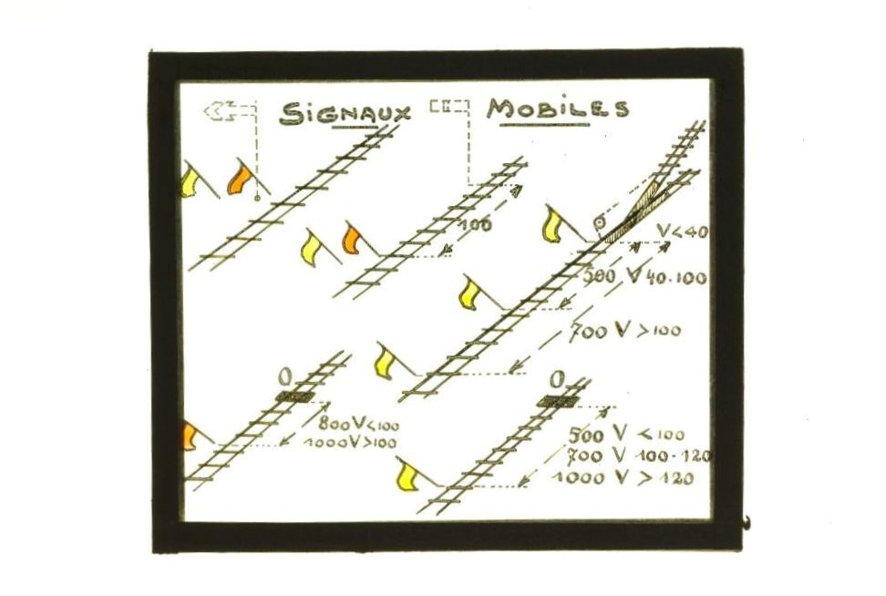 Dit glasplaatje werd als didactisch materiaal gebruikt bij de opleiding van spoorwegpersoneel. Op het glasplaatje staan enkele mobiele seinen. Een rode vlag die aan het spoor werd geplaatst beveelt een onmiddellijke stilstand. Een gele vlag die aan het spoor werd geplaatst kan aankondigen dat de voorgaande trein niet genoeg vooruit rijdt en dat de achtervolgende trein trager moet rijden, of het kan ook dienen om de treinbestuurder te waarschuwen voor een stuk baan in slechte staat of een herstelling op 500 meter. Indien één van deze twee situaties zich blijft voordoen over een langer stuk baan, wordt er om de 1000 meter een nieuwe gele vlag geplaatst.