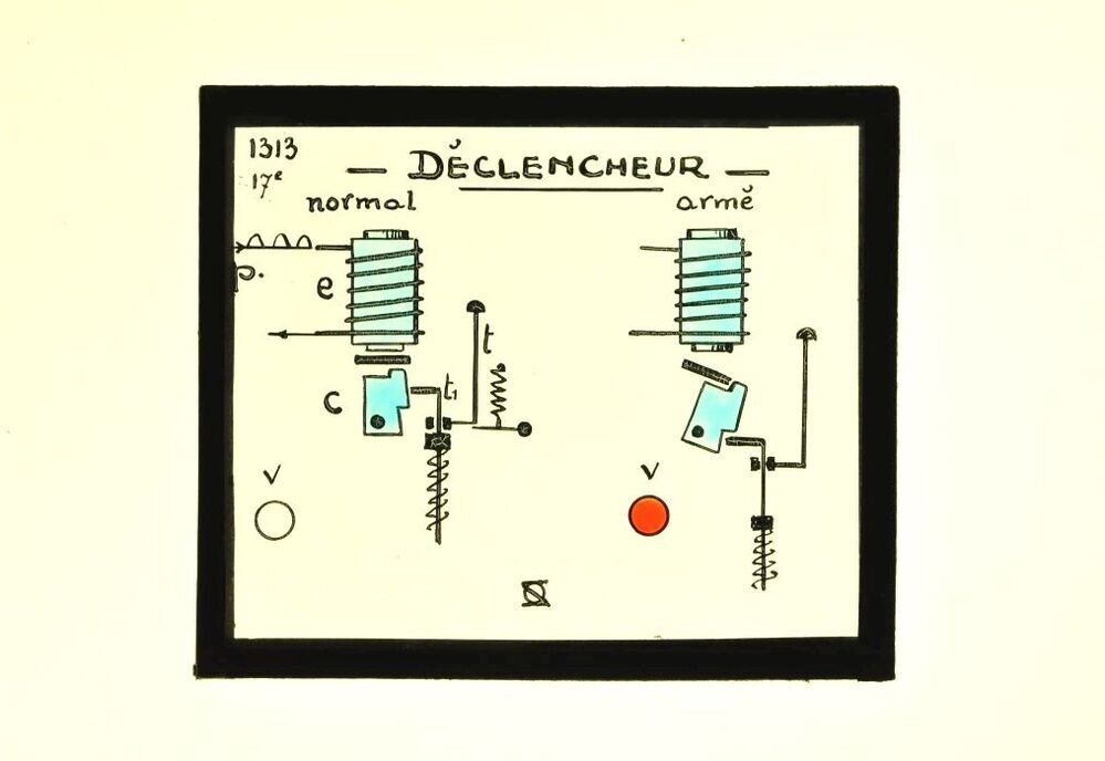Dit glasplaatje werd als didactisch materiaal gebruikt bij de opleiding van spoorwegpersoneel. Op het plaatje staan twee technische tekeningen van een losser. De ene toont de losser in normale staat, de andere in geactiveerde staat. De tekening is met blauw en rood ingekleurd.