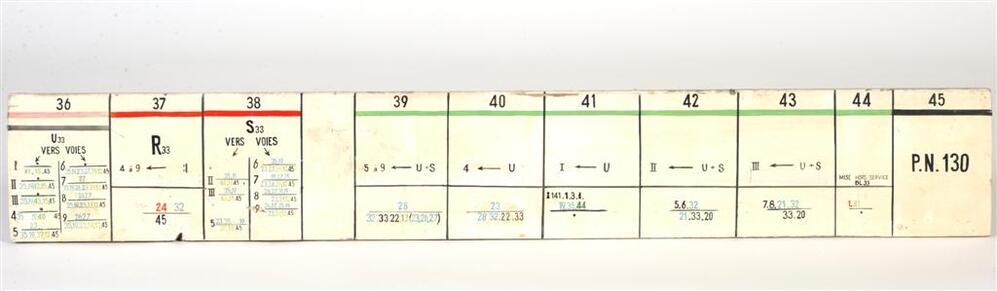 Deze tabel met verschillende kolommen werd boven een seingestel gemonteerd. In de kolommen, genummerd van 36 tot 45, staan verschillende codes en opsommingen van de nummers van de sporen. Dit zijn reiswegplaatjes die aanduiden welke stand de seinen en wissels moeten innemen bij de aanleg van een reisweg. Deze tabel maakte deel uit van het seinhuis te Quiévrain (blok 33).