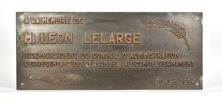 Leon Lelarge was medewerker bij de Belgische spoorwegen en ging in 1943 bij het verzet. Daar was hij het brein achter talrijke vernietigingen van de spoorweginfrastructuur. Na de bevrijding werd hij vicepresident van de NMBS. Op deze gedenkplaat staan naast en onder het opschrift drie palmtakjes. De plaat hing in het voormalige gebouw van de centrale administratieve dienst van de NMBS aan de Leuvenseweg.