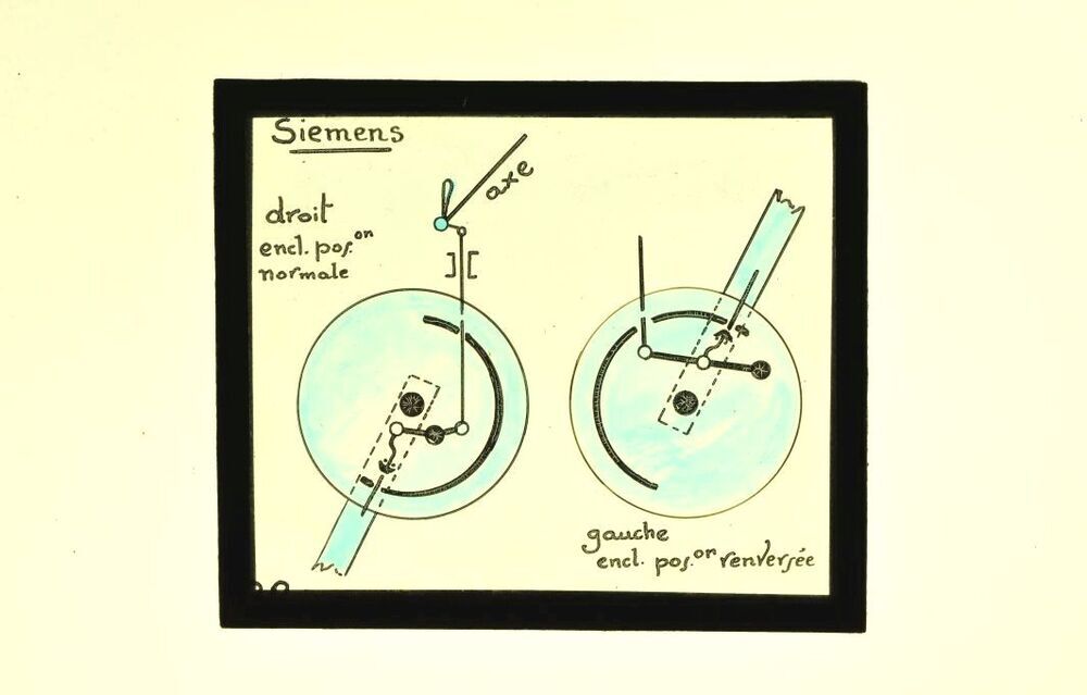 Dit glasplaatje werd als didactisch materiaal gebruikt bij de opleiding van spoorwegpersoneel. Op het plaatje staat een technische tekening in de kleuren blauw en zwart. De twee tekeningen tonen een doorsnede van een onderdeel van een Siemens seingestel. Het onderdeel werd in zijn normale en omgekeerde positie weergegeven. Links onderaan staat het nummer '20'.