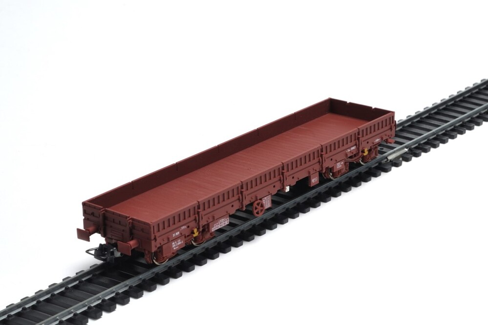 Deze bruine platte wagen heeft twee draaistellen en zijdelings neerklapbare wanden. Er staan verschillende opschriften op de zijkanten, zoals de lettercode Remms, het typenummer 3514C3 en het identificatienummer 31 88 395 2 080-2. De maquette is op schaal H0 1/87 vervaardigd.