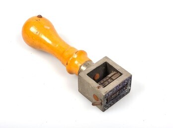 TitelMetalen stempel 'Aarschot' en een verrolbare datum met houten handvat