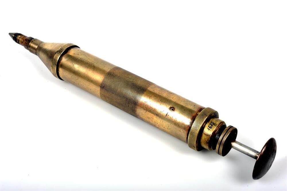 BeschrijvingDeze cillindervormige smeerkan uit geelkleurig metaal heeft een reservoir, een dunner lopende spuit en een hendel met een veermechanisme. Vooraan op de handsmeerpomp staat het opschrift 'Standard'. De rest is niet meer leesbaar.