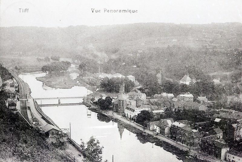 BeschrijvingReproductie van een postkaart met als opschrift 'Tilff Vue Panoramique'. De postkaart toont een luchtfoto van het dorp en de omgeving. Aan de overzijde van de Ourthe is het station te zien.