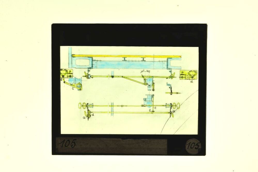 BeschrijvingDit glasplaatje werd als didactisch materiaal gebruikt bij de opleiding van spoorwegpersoneel. Er staat een doorsnede op die de werking van een remsysteem illustreert. De tekening is in de kleuren blauw, geel en groen uitgevoerd.