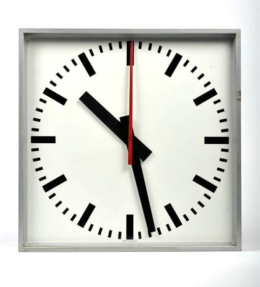 Deze klok is uit metaal en kunststof vervaardigd. De wijzers zijn sober en er staan geen getallen op de wijzerplaat. De secondewijzer is rood. Dit type klok ziet men vandaag nog steeds op vele perrons.