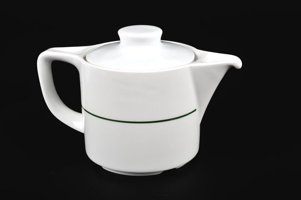BeschrijvingWitte kan met een enkele groene bies. De kan heeft een recht oor en een horizontale tuit.