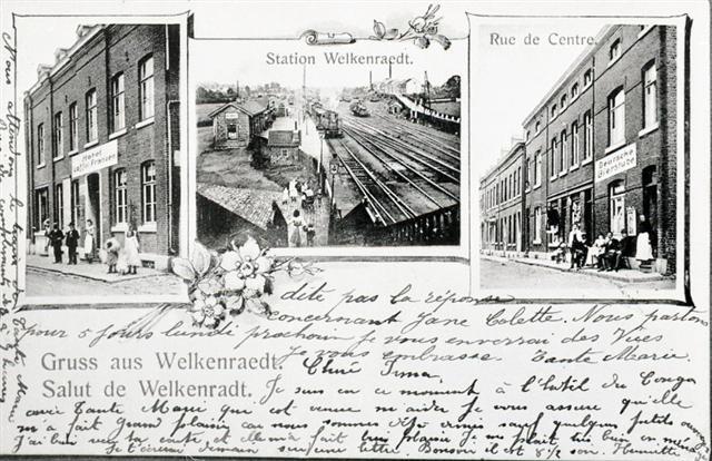 Reproductie van een postkaart met als opschrift 'Gruss aus Welkenraedt. Salut de Welkenradt.' Op de postkaart staan drie foto's: links het Hotel Loffel-Franzen, in het midden het station Welkenraedt en rechts de Rue du Centre. De foto van het station is genomen in vogelperspectief. We zien een vrouw en een kind de trap naar het station aflopen. Een stoomtrein nadert het perron. Op de voorkant van de postkaart staat ook een handgeschreven boodschap.