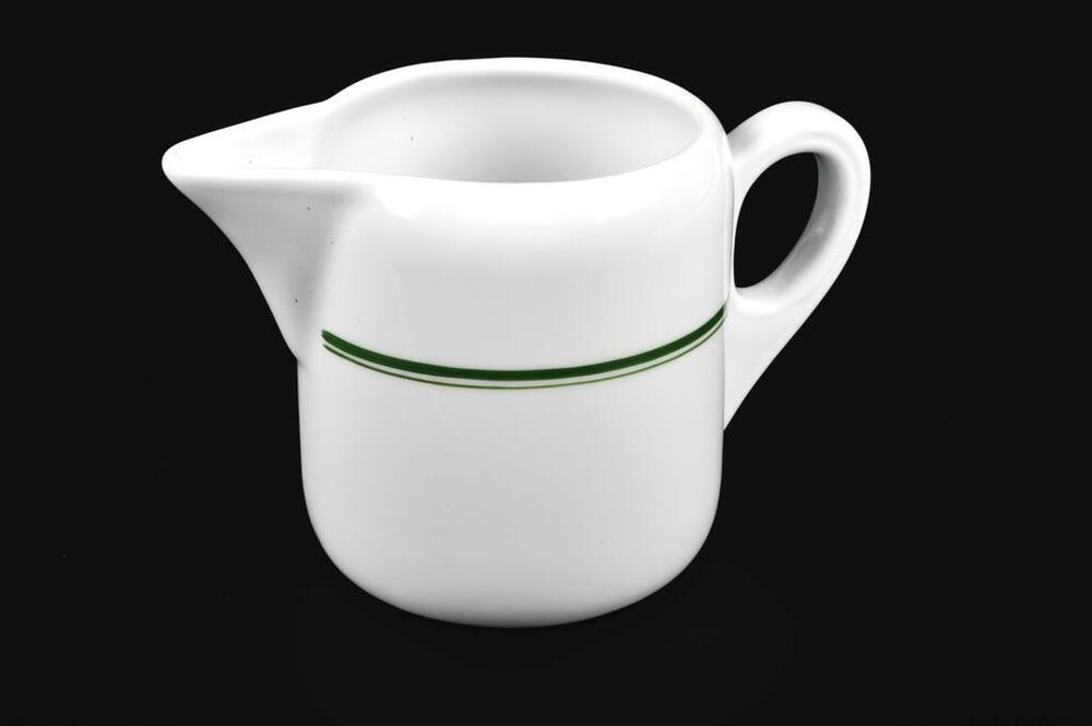 BeschrijvingWit kannetje met twee groene biezen, een oor en een spitse schenktuit.