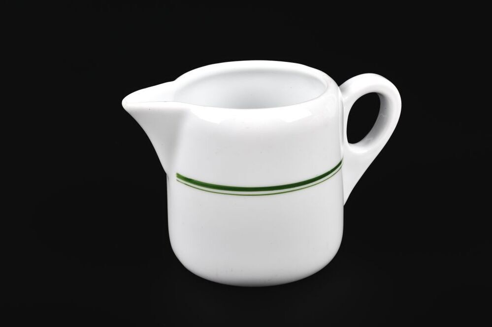 BeschrijvingWitte kan met een dubbele groene bies, een oor en een spitse schenktuit.