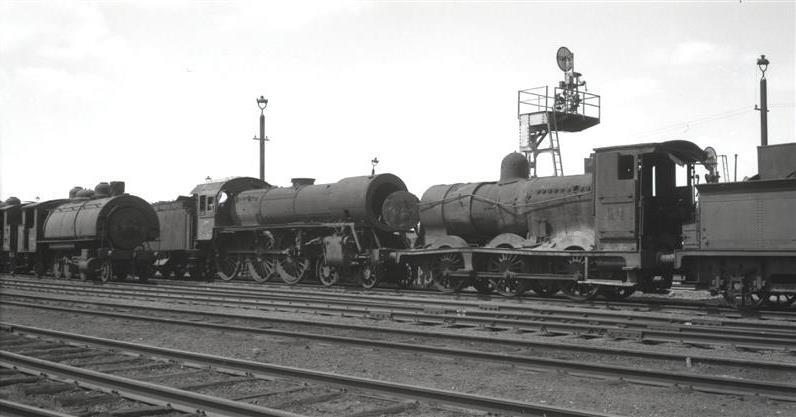 BeschrijvingOp deze foto zien we stoomlocomotieven 57.023 (type 57 - 1C1t), 6212 (type 62 - 2C Ten Wheel) en 4146 (type 41 - C Bourbonnais). Op de achtergrond staat een mechanisch sein op een plateau.
