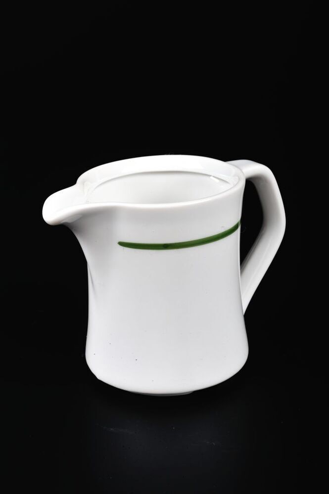 BeschrijvingWit kannetje met een enkele groene bies en een open tuit.