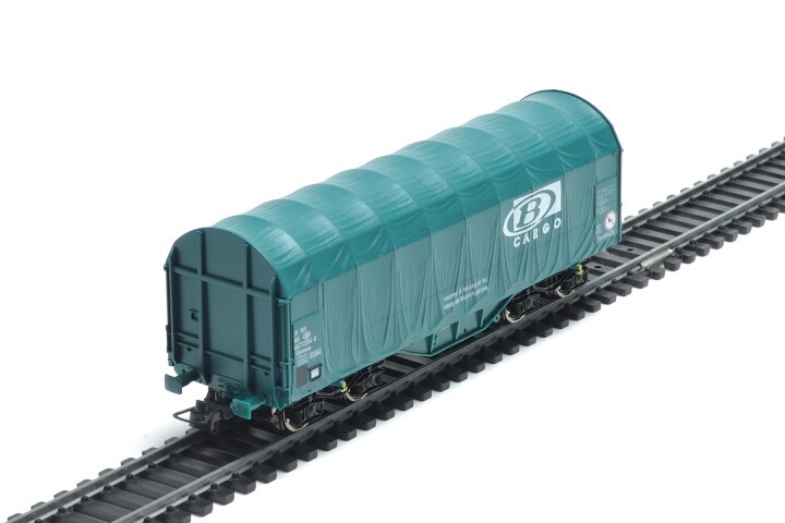 Deze groene platte wagen met groene huif dient voor het vervoer van rollen plaatstaal. Op de zijkanten staan verschillende opschriften, zoals het identificatienummer, de lettercode Shimmns en het typenummer 3614D6. De maquette is op schaal H0 1/87 vervaardigd.