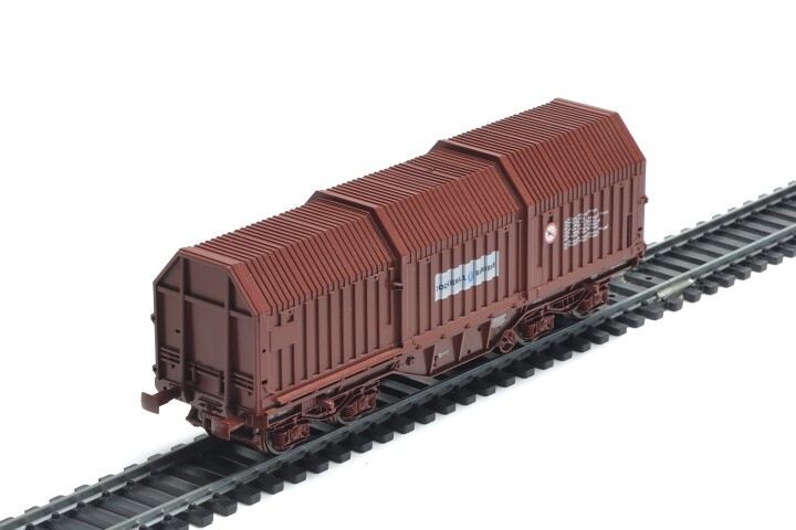 Bruine platte wagen op draaistellen voor het vervoer van horizontale rollen plaatijzer. De wagen heeft drie trapsgewijze huiven. Op de zijkanten staan verschillende opschriften, zoals het identificatienummer, de lettercode Shimms, het typenummer 3614B0 en 'Cockerill - Sambre'. De maquette is op schaal H0 1/87 vervaardigd.
