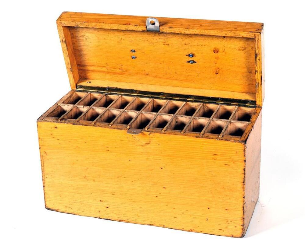 BeschrijvingDeze houten kist met metalen handvat is onderverdeeld in 22 gelijke compartimenten. De kist kon door middel van een hangslot worden gesloten.