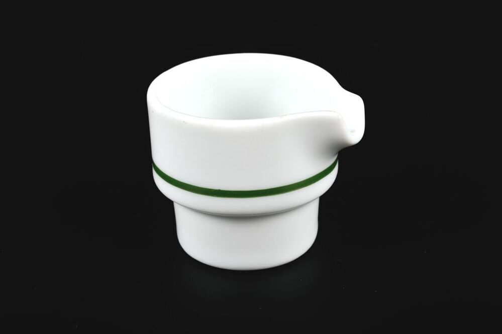 BeschrijvingWit kannetje met een enkele groene bies en een open schenktuit. Het kannetje heeft geen oor.