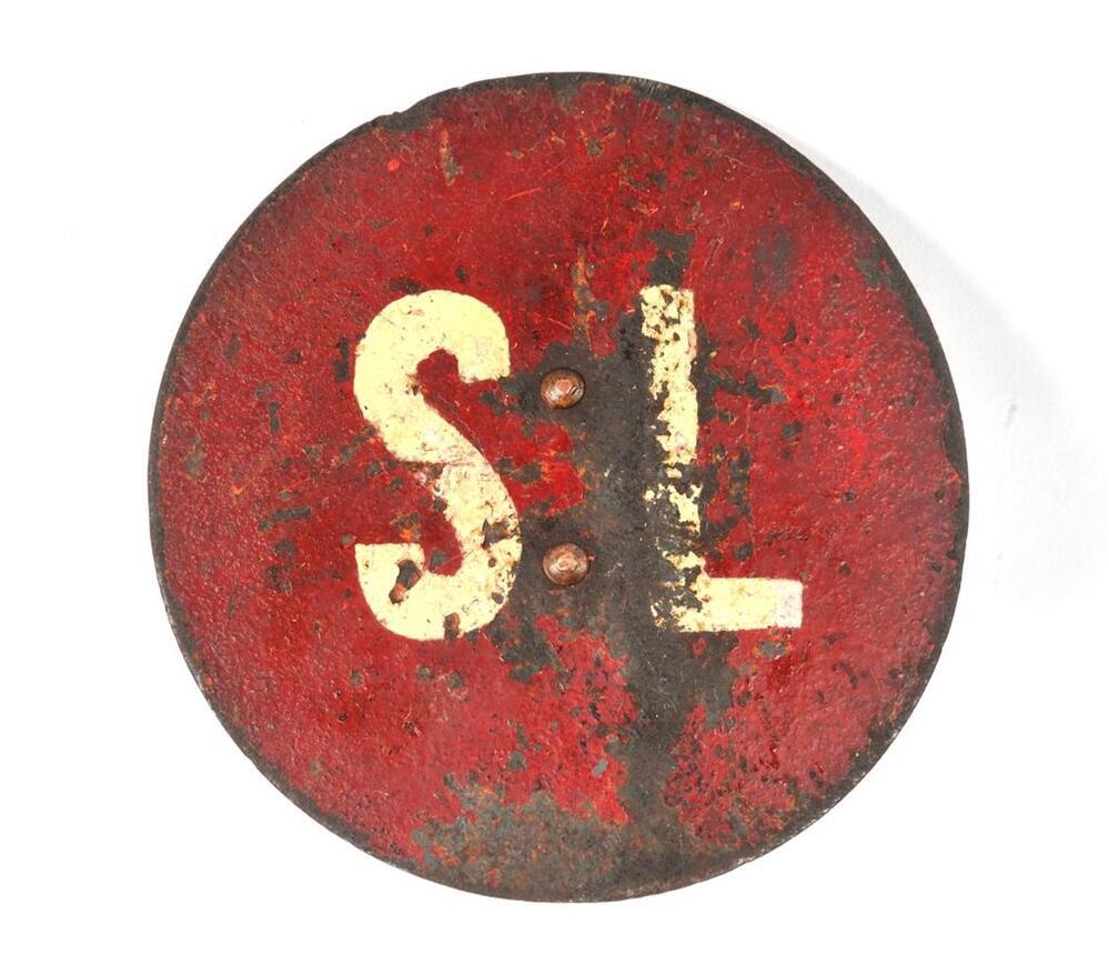 Dit ronde bord met wit opschrift werd vermoedelijk aan de defecte onderdelen van het rollend materieel vastgemaakt in het vooruitzicht van hun herstel in een werkplaats. De letters ‘S’ en ‘L’ staan vermoedelijk voor ‘souder’ en ‘lassen’.