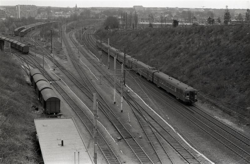 De foto is getrokken vanop een brug. We zien een sporenbundel met rechts een reizigerstrein bestaande uit drie tweeledige motorstellen (de eerste is motorstel 193). Links en achteraan zijn enkele goederentreinen (met gesloten wagens) geparkeerd. Schenking van Myriam Hendrickx.