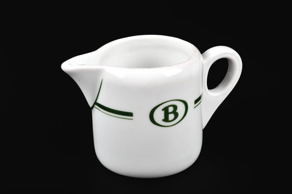 BeschrijvingWitte kan met een dubbele groene bies en het NMBS-logo. Ook aan het oor en de schenktuit zijn groene biezen.