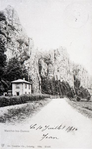 Reproductie van een postkaart met als opschrift 'Marche-les-Dames Dr. Trenkler Co., Leipzig. 1904. 27 419'. Naast het opschrift werd met de hand nog 'Le 10 Juillet 1906 Jean' geschreven. Op de postkaart zien we een straat die iets verderop wordt afgesloten door een overweg met rolbareel. Links staat het huisje van de overwegwachter. Op de achtergrond zien we de rotsen van Marche-les-Dames.