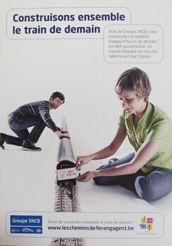 Titre"Construisons ensemble le train de demain Avec le Groupe SNCB, vous construisez la mobilité d'aujourd'hui et de demain. Un défi passionnant, un travail d'équipe où tous les talents ont leur chance. Envie de construire ensemble le train de demain? www.lescheminsdeferengagent.be" (Groupe SNCB)