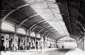 DescriptionReproduction d’une carte postale avec comme inscription "1 Braine-Le-Comte Intérieur de la Gare". On y voit l’intérieur de la marquise. Le personnel de gare et quelques voyageurs posent sur le premier quai.