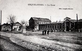 DescriptionReproduction d’une carte postale portant l’inscription "Erquelinnes. - La Gare Edit. Longfils-Merelle". La carte montre une partie de la façade avant de la gare. Sur la place de la gare posent quelques passants.
