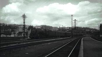 DescriptionNous voyons la locomotive à vapeur 29.050 du type 29 (1 D - Consolidation) en gare de Namur. Elle entre en gare avec le train n°1435 originaire de Jemelle, composé de voitures K.