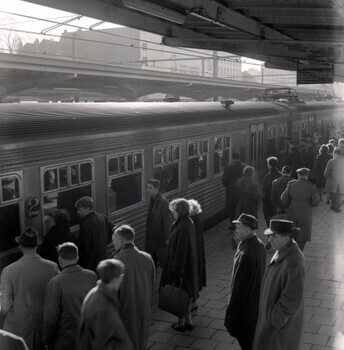 DescriptionUn train composé d’automotrices 1956 (Budd) entre en gare. Sur le quai, les voyageurs s’apprêtent à embarquer. Des auvents sont installés sur les quais.