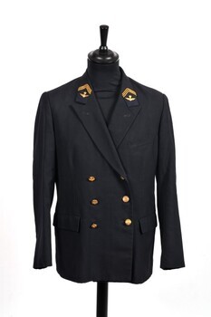 DescriptionCette veste bleue d’uniforme a une double rangée de boutons illustrés d’une roue ailée couronnée. Devant, deux poches et une petite poche de poitrine, à l’intérieur, deux petites poches de poitrine. Quelques insignes sont rapportés sur les revers : un jonc triple jaune brun et une épinglette dorée (roue ailée et couronnée avec le logo de la SNCB).