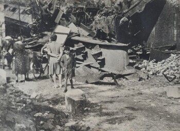 DescriptionLa photo montre un pont qui a été détruit par la Résistance. Le but était de réduire la mobilité de l’occupant. Deux femmes et des enfants contemplent les dégâts.
