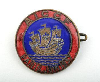 DescriptionBouton coloré de forme ronde (2 pièces) ou pin’s (1 pièce). Dans le champ, une nef sur un fond émaillé bleu, symbole des armoiries de Paris. La légende est rouge et porte l’inscription « AICCF Paris juin 1937 ».